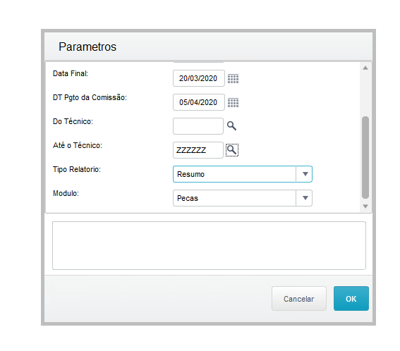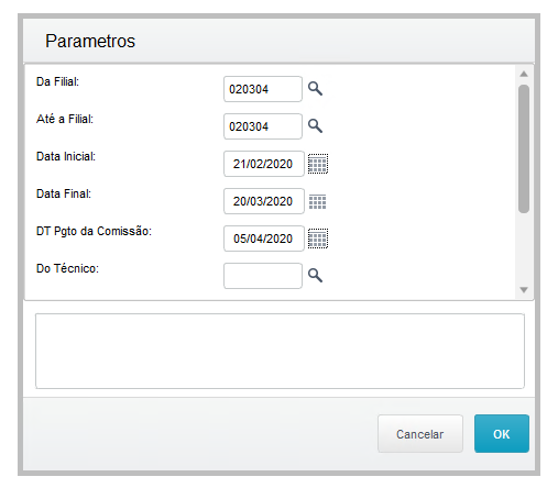 Como queremos todos os consultores, deixamos as opções do técnico de “Branco” a “ZZZZZZ”, dessa forma todos os consultores serão listados, caso queira um especifico, pesquisar o PM e deixar o mesmo nos dois campos.