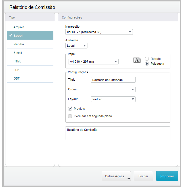 Temos as opções de impressão normal (que seria PDF ou direto na impressora) selecionando a opção Spool, e selecionando a impressora desejada: Dopdf ou Ricoh Por exemplo, sempre definir o tipo de papel como A4 conforme imagem abaixo:
