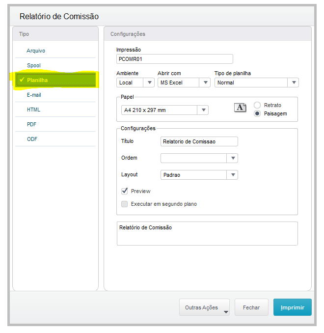 1.2 Agora vamos emitir o mesmo relatório em planilha, usando os mesmos parâmetros: