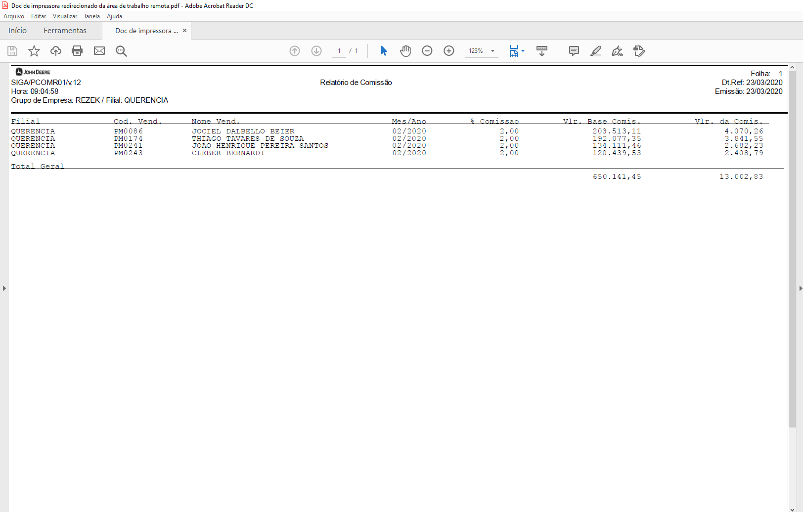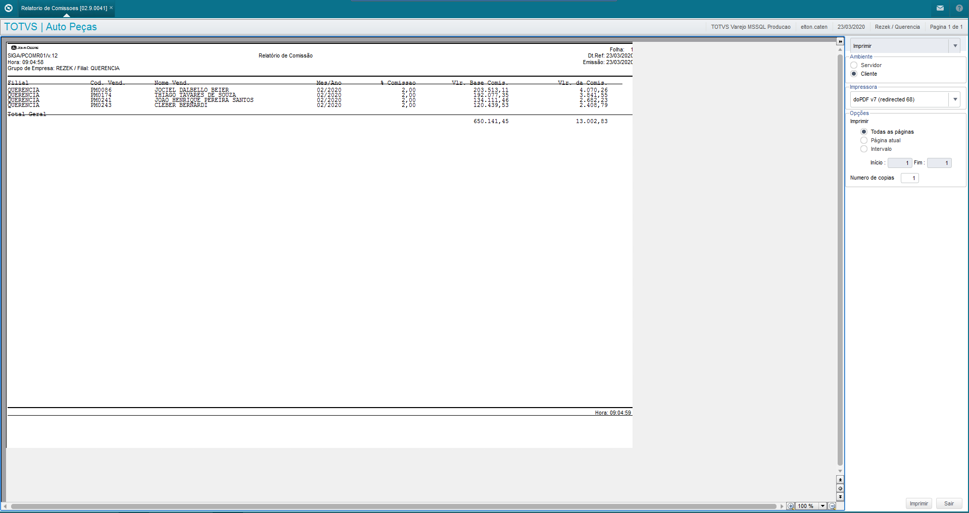 No nosso exemplo vamos tirar o relatório do setor de peças (balcão) apenas de Querencia, a filial deve ser de / até com a filial desejada, a data será a critério do usuário:
