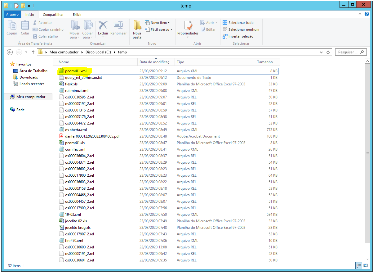Altere a pasta para que a visualização seja por data da modificação, nosso relatório estará no topo conforme imagem abaixo, temos de alterar a extensão do mesmo de .XML para .XLS: