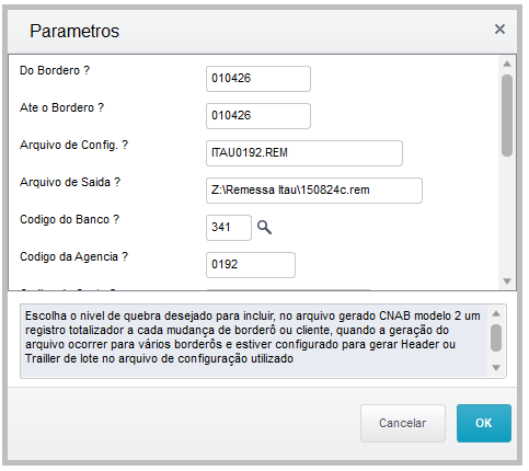 Acessar a rotina: Atualizações > Comunicação Bancária > Arquivos de Cobranças e preencher os parâmetros conforme imagens abaixo com atenção especial ao campo CONFIGURAÇÃO CNAB, para o Itaú será MODELO 1.