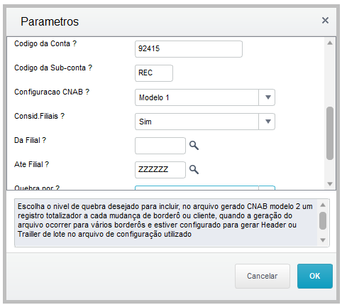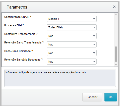 Acessar a rotina: Atualizações > Comunicação Bancária > Retorno de Cobranças e preencher os parâmetros conforme imagens abaixo